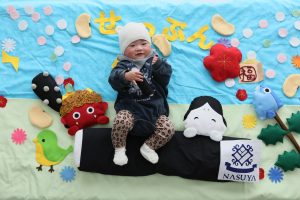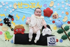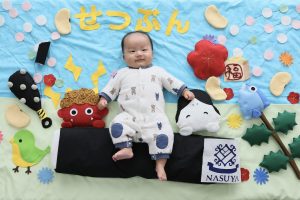 赤ちゃんたちが節分モチーフのアートに囲まらながら撮影!
